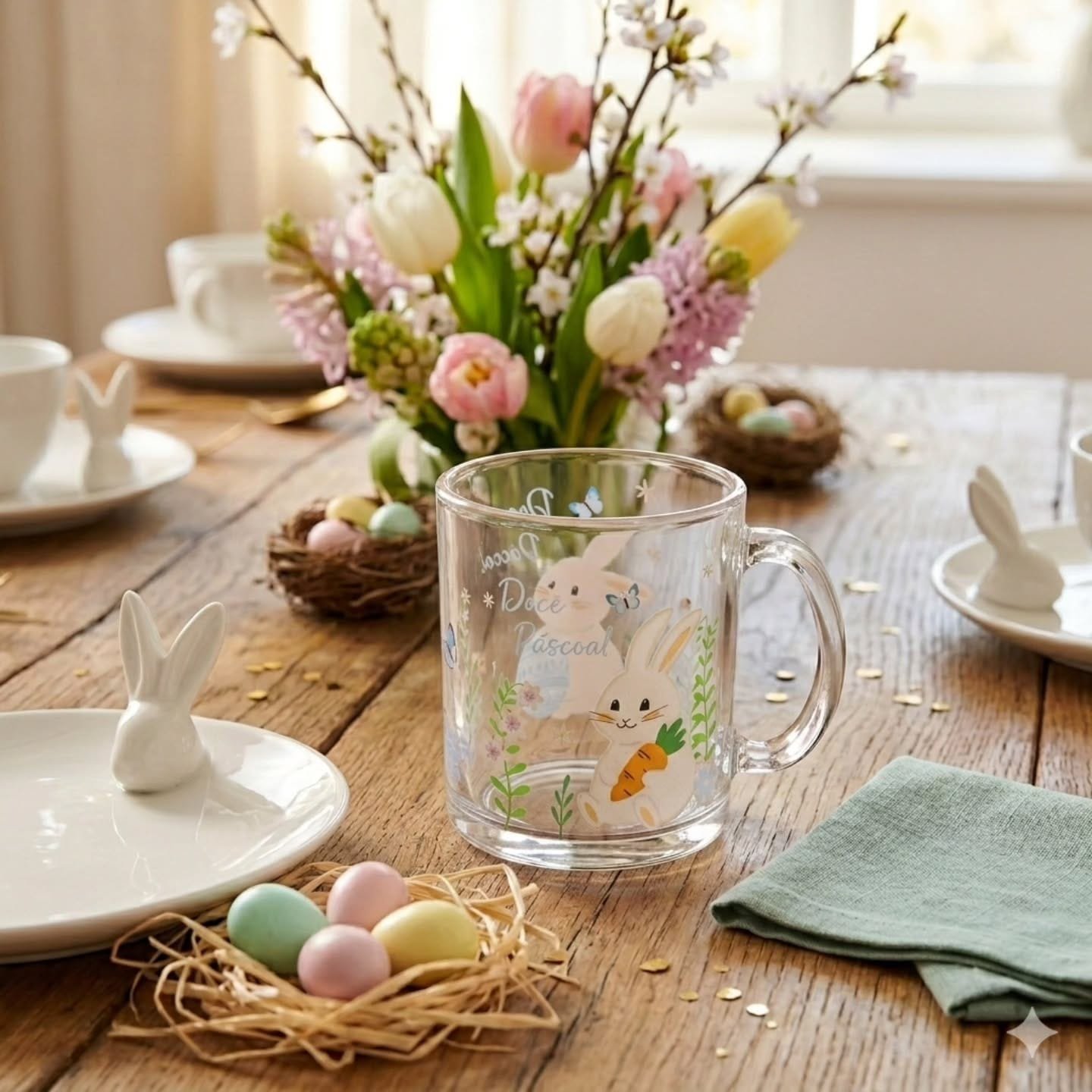 Lembrancinha de Páscoa Caneca de Vidro 330ml com Kit Coelhinho