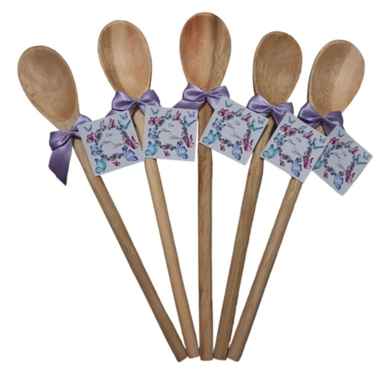 Colher de pau artesanal, medindo cerca de 26 cm de comprimento, 4 cm de largura e 0,5 cm de altura, que completa o visual rústico e acolhedor da lembrança.